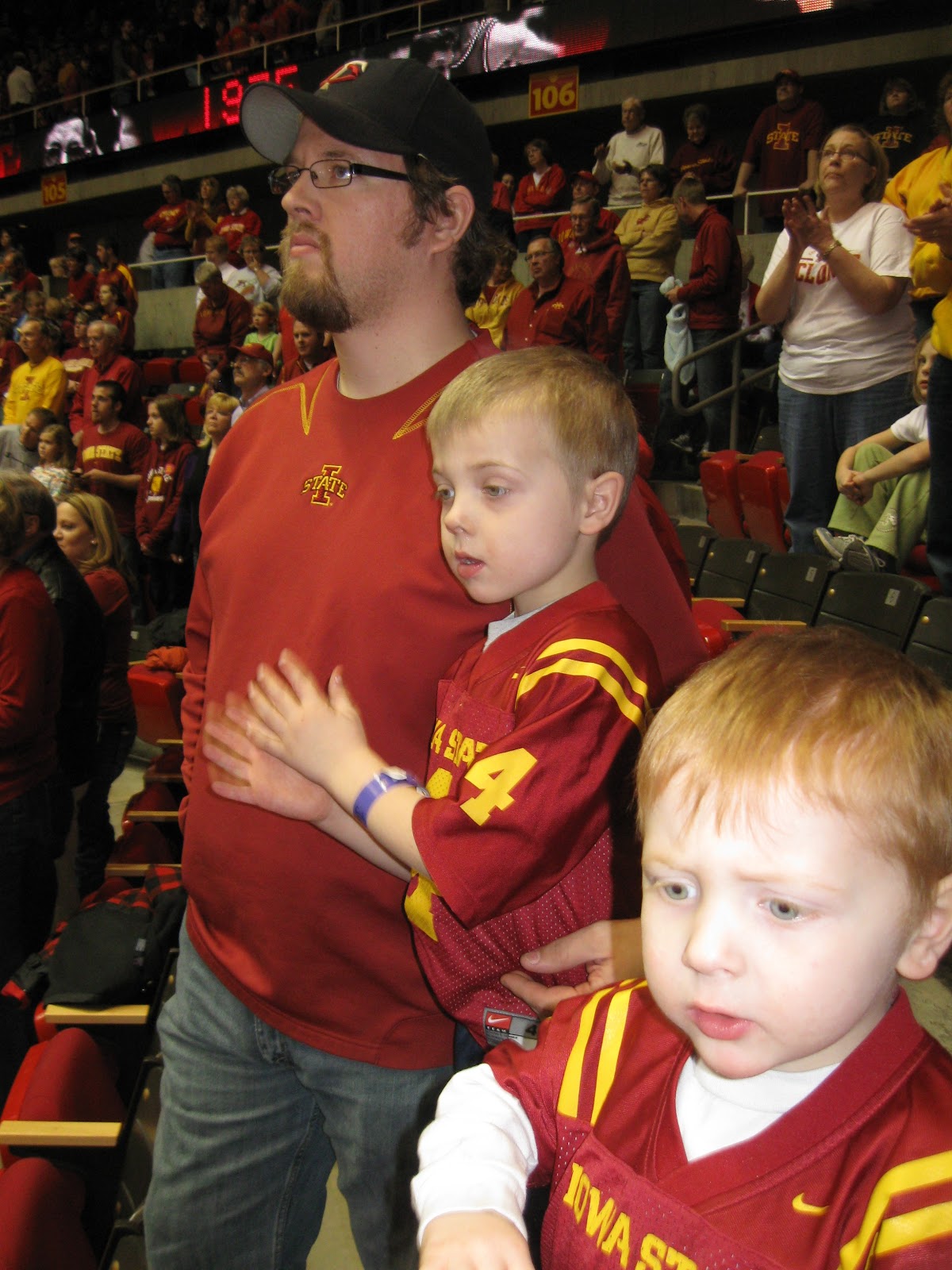 We were able to get mens basketball tickets from Carl's work for the ISU basketball game on Saturday. Gabe and Carl were supposed to go with Gabe's friend Brady and his Daddy but Brady was sick all week and feeling really rotten on Saturday so he wasn't able to come. Gabe was bummed that Brady didn't get to come and he had to go to the game with his mom and little brother instead but oh-well. My mom and dad kept Callie at their house during the game since it fell during her nap time and she slept the whole game for them, it was nice not to have her wiggling all over the place:) Carl's work also gets wristbands to Johnny's(they designed it as well!) so we took the boys there for some pregame snacks. When we got to our seats I tried to get the boys to stand for a picture in front of the court for me but little fingers had smeared up my lens so it didn't look very good.